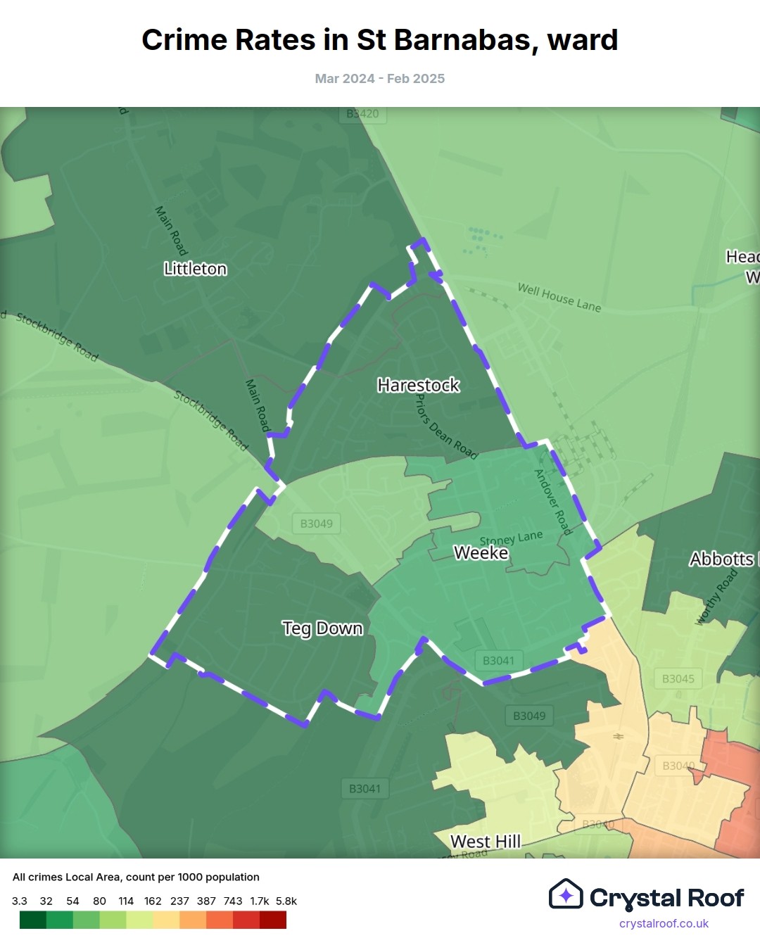 St Barnabas (ward) is located within Winchester (borough). Annual total crime rate in Winchester (borough) is 64.9 crimes per thousand resident population, which can be rated as 2 out of 10 or low crime level compared to other local authority districts in England and Wales.