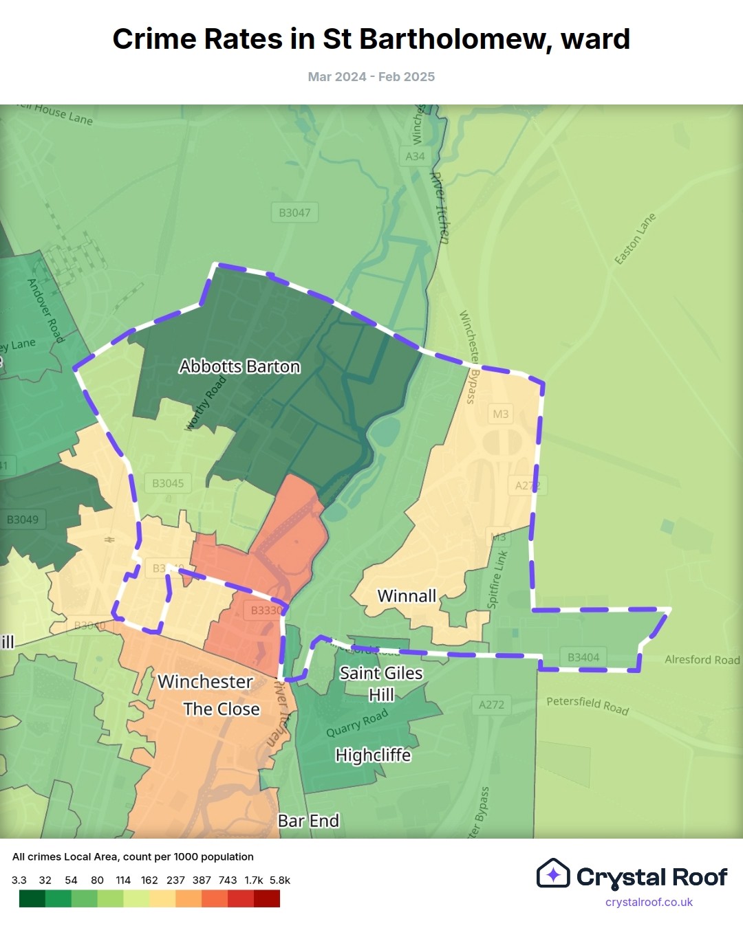 St Bartholomew (ward) is located within Winchester (borough). Annual total crime rate in Winchester (borough) is 64.9 crimes per thousand resident population, which can be rated as 2 out of 10 or low crime level compared to other local authority districts in England and Wales.