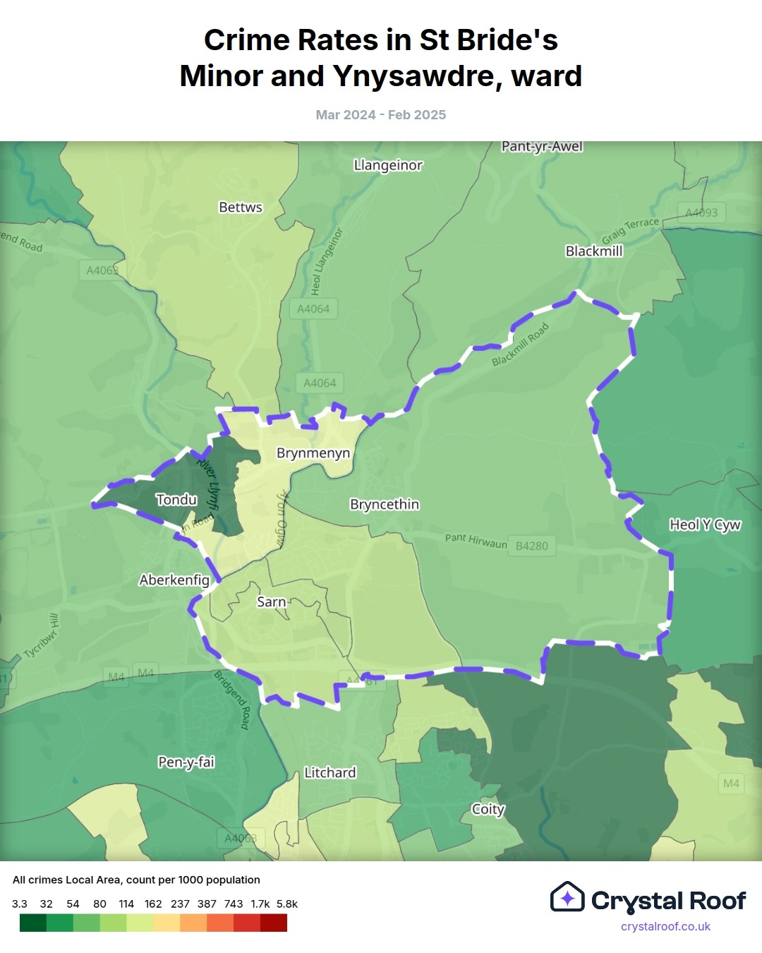 St Bride's Minor and Ynysawdre, (ward) includes areas with the following crime ratings (see map):