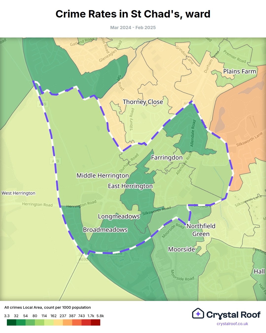 St Chad's (ward) is located within Sunderland (borough). Annual total crime rate in Sunderland (borough) is 122 crimes per thousand resident population, which can be rated as 6 out of 10 or medium crime level compared to other local authority districts in England and Wales.