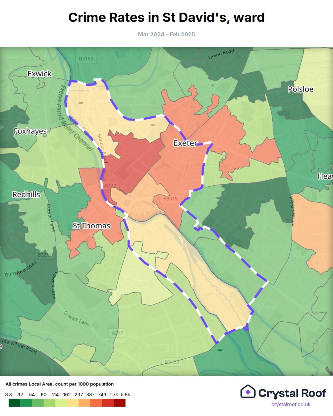 St David's (ward) is located within Exeter (borough). Annual total crime rate in Exeter (borough) is 121 crimes per thousand resident population, which can be rated as 6 out of 10 or medium crime level compared to other local authority districts in England and Wales.