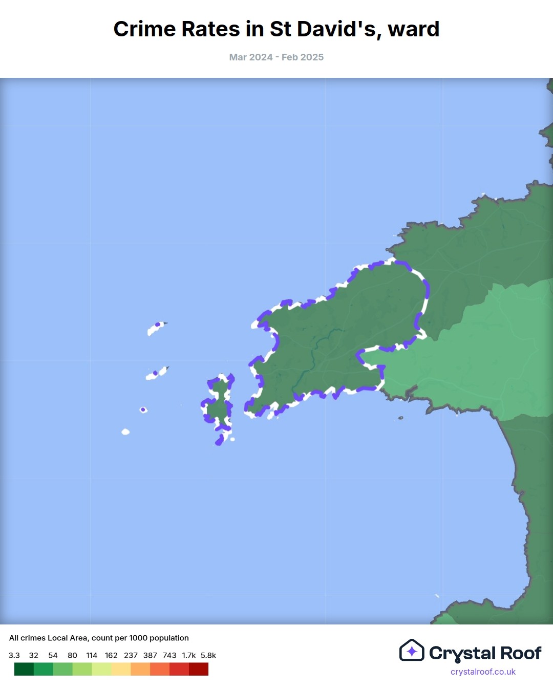 St David's (ward) is located within Pembrokeshire (borough). Annual total crime rate in Pembrokeshire (borough) is 85 crimes per thousand resident population, which can be rated as 3 out of 10 or low crime level compared to other local authority districts in England and Wales.