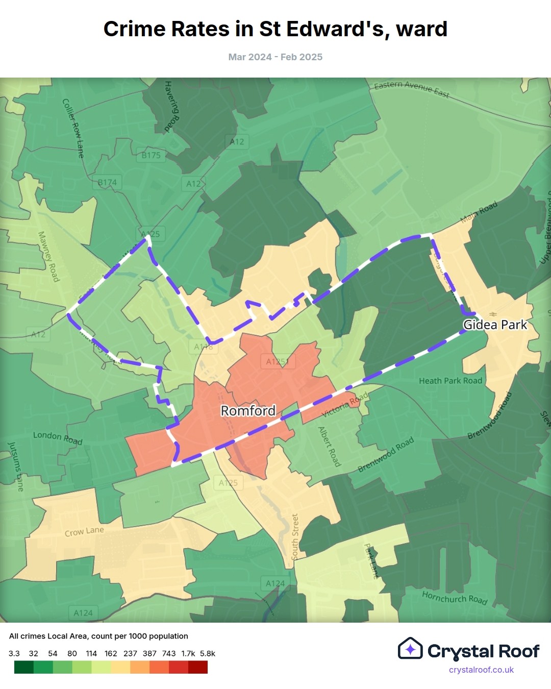 St Edward's (ward) is located within Havering (borough). Annual total crime rate in Havering (borough) is 92.9 crimes per thousand resident population, which can be rated as 4 out of 10 or low crime level compared to other local authority districts in England and Wales.