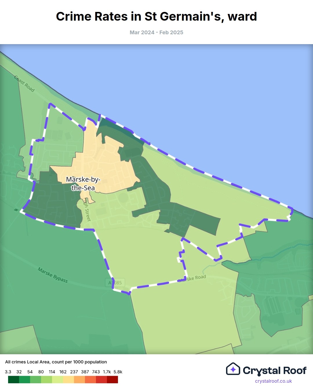 St Germain's (ward) is located within Redcar and Cleveland (borough). Annual total crime rate in Redcar and Cleveland (borough) is 139 crimes per thousand resident population, which can be rated as 7 out of 10 or high crime level compared to other local authority districts in England and Wales.