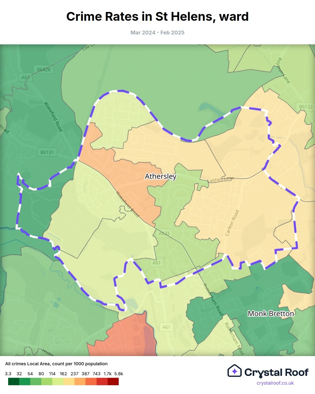 St Helens, (ward) includes areas with the following crime ratings (see map):