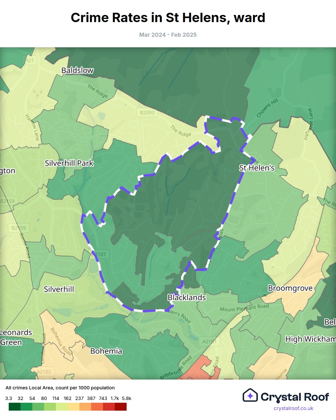 St Helens, (ward) includes areas with the following crime ratings (see map):