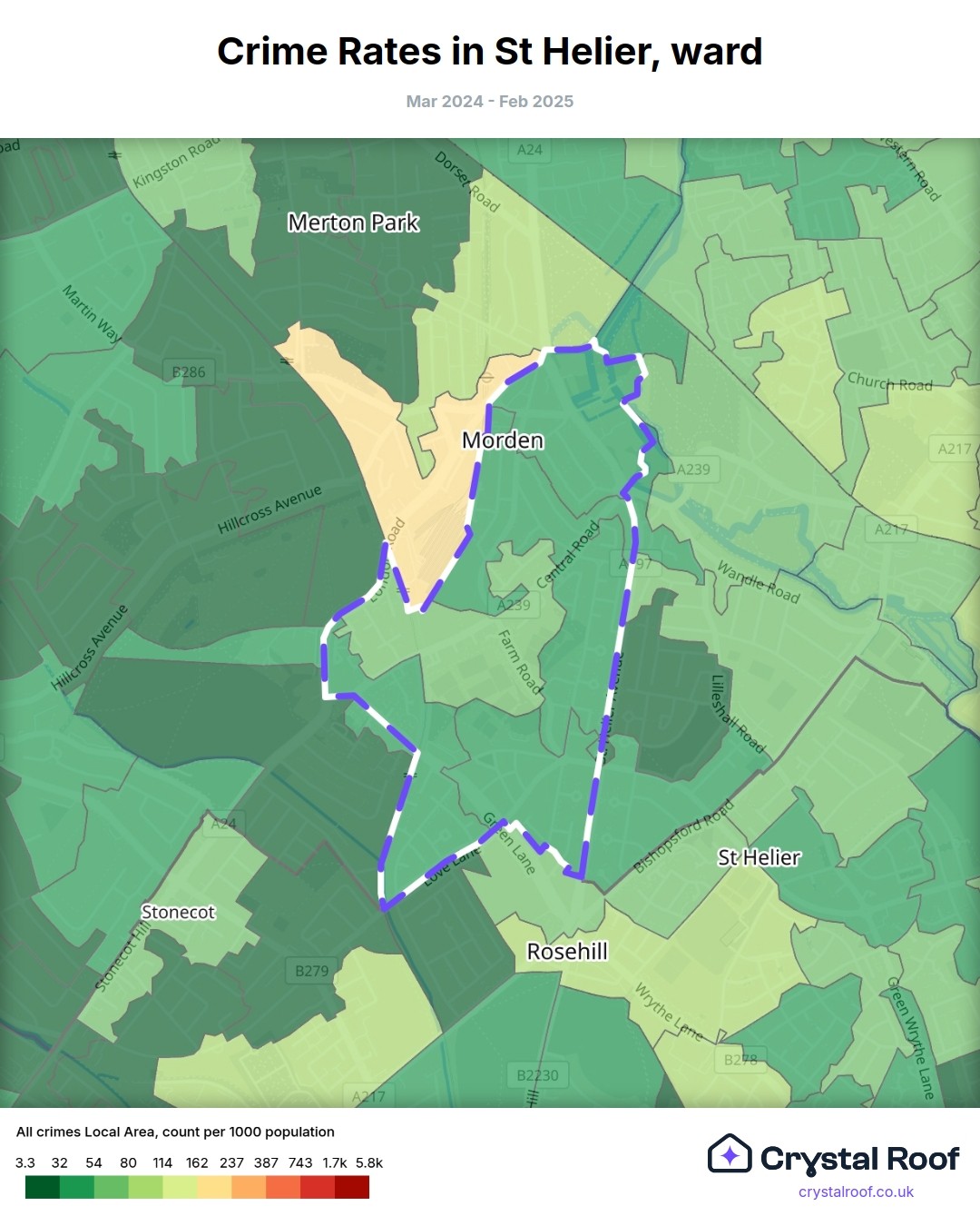 St Helier, (ward) includes areas with the following crime ratings (see map):