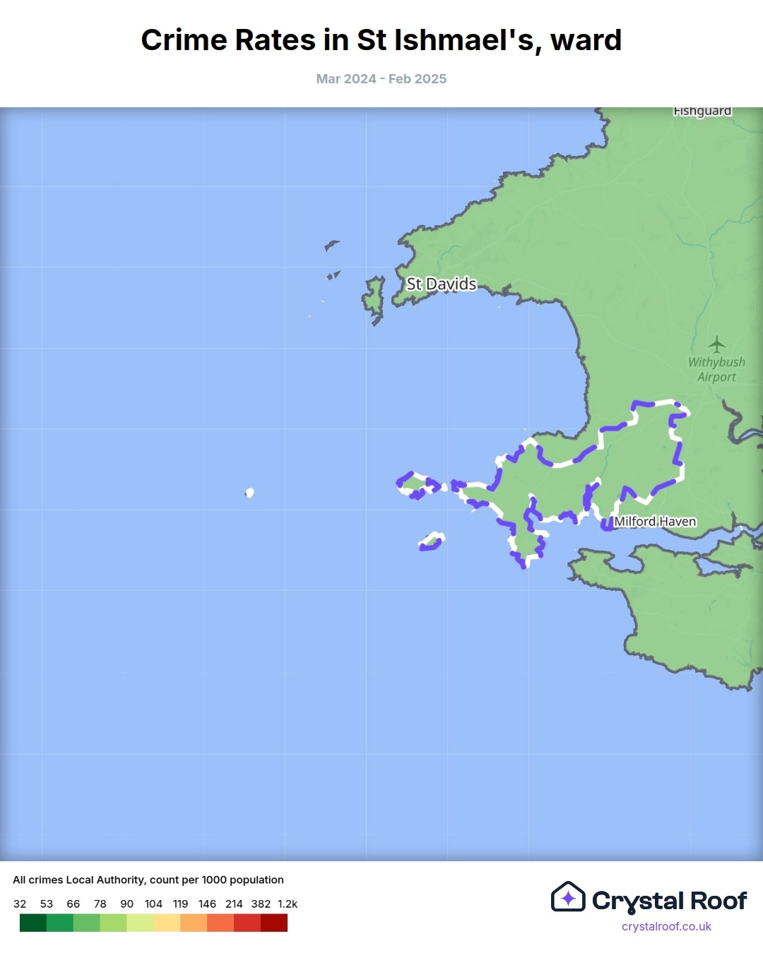 St Ishmael's (ward) is located within Pembrokeshire (borough). Annual total crime rate in Pembrokeshire (borough) is 85 crimes per thousand resident population, which can be rated as 3 out of 10 or low crime level compared to other local authority districts in England and Wales.