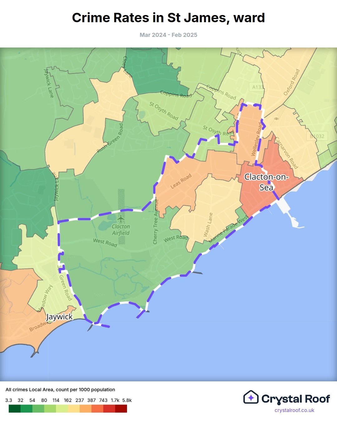 St James (ward) is located within Tendring (borough). Annual total crime rate in Tendring (borough) is 93 crimes per thousand resident population, which can be rated as 4 out of 10 or low crime level compared to other local authority districts in England and Wales.