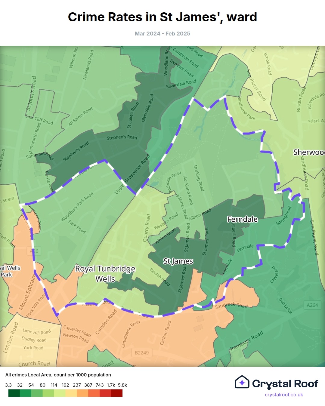 St James' (ward) is located within Tunbridge Wells (borough). Annual total crime rate in Tunbridge Wells (borough) is 67.9 crimes per thousand resident population, which can be rated as 2 out of 10 or low crime level compared to other local authority districts in England and Wales.