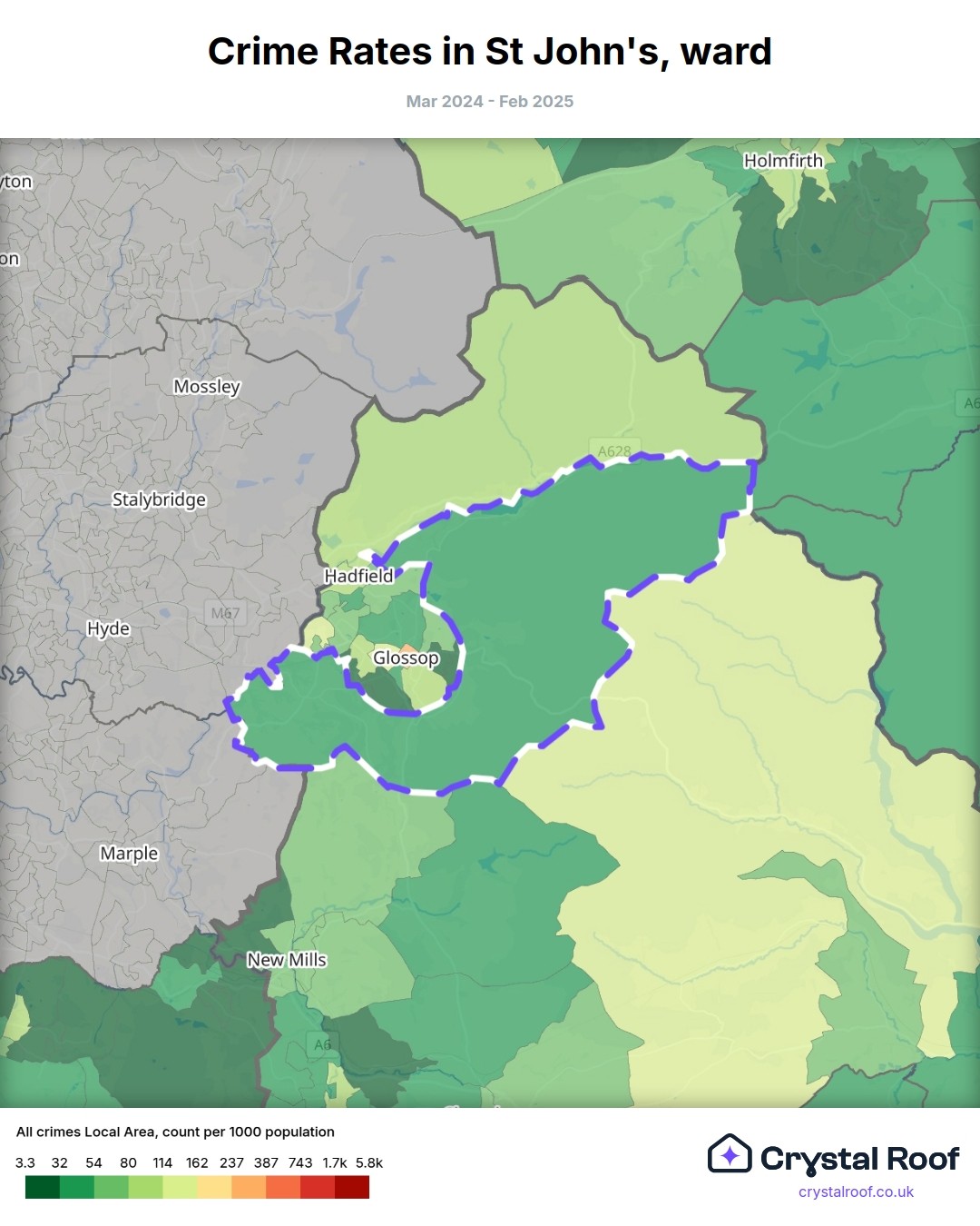 St John's (ward) is located within High Peak (borough). Annual total crime rate in High Peak (borough) is 73.9 crimes per thousand resident population, which can be rated as 3 out of 10 or low crime level compared to other local authority districts in England and Wales.