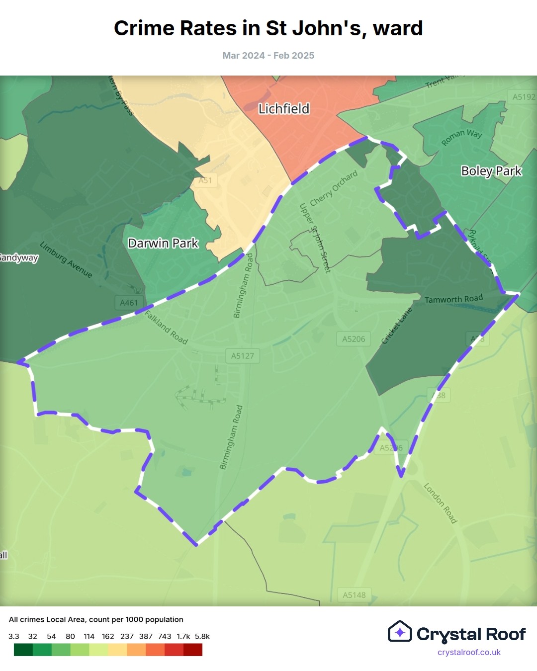 Historical crime rates in St John's (ward), Lichfield (local authority district) and West Midlands (region)