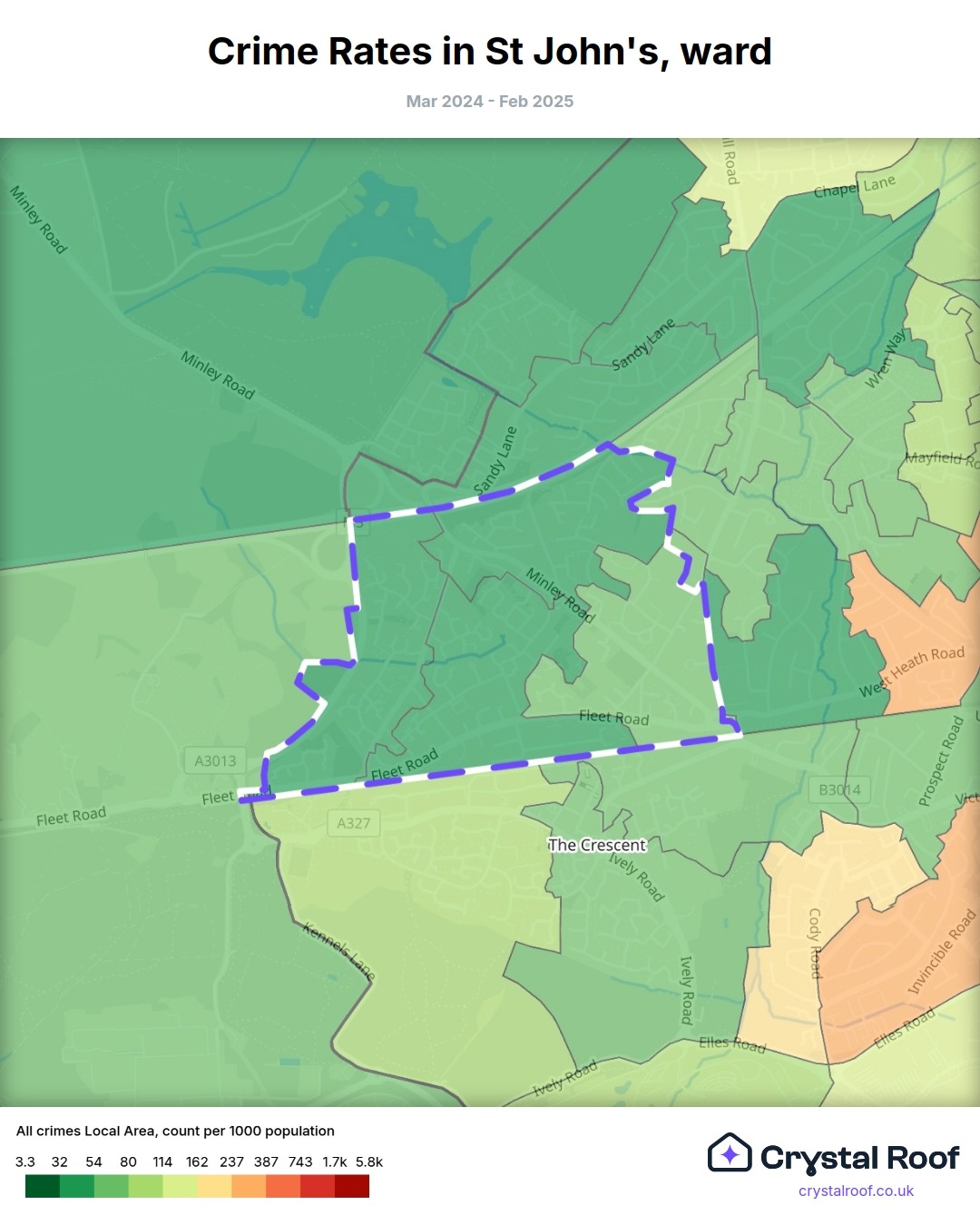 St John's (ward) is located within Rushmoor (borough). Annual total crime rate in Rushmoor (borough) is 87.9 crimes per thousand resident population, which can be rated as 4 out of 10 or low crime level compared to other local authority districts in England and Wales.
