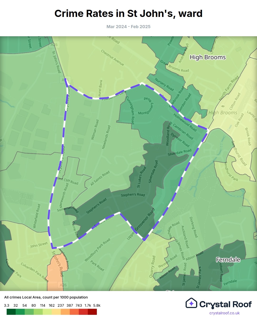 St John's (ward) is located within Tunbridge Wells (borough). Annual total crime rate in Tunbridge Wells (borough) is 67.9 crimes per thousand resident population, which can be rated as 2 out of 10 or low crime level compared to other local authority districts in England and Wales.