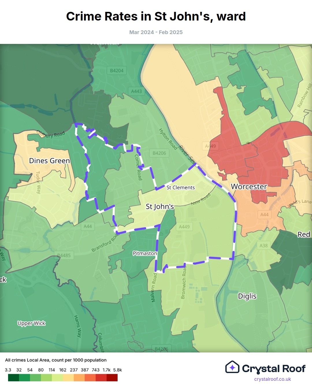 St John's (ward) is located within Worcester (borough). Annual total crime rate in Worcester (borough) is 119 crimes per thousand resident population, which can be rated as 6 out of 10 or medium crime level compared to other local authority districts in England and Wales.