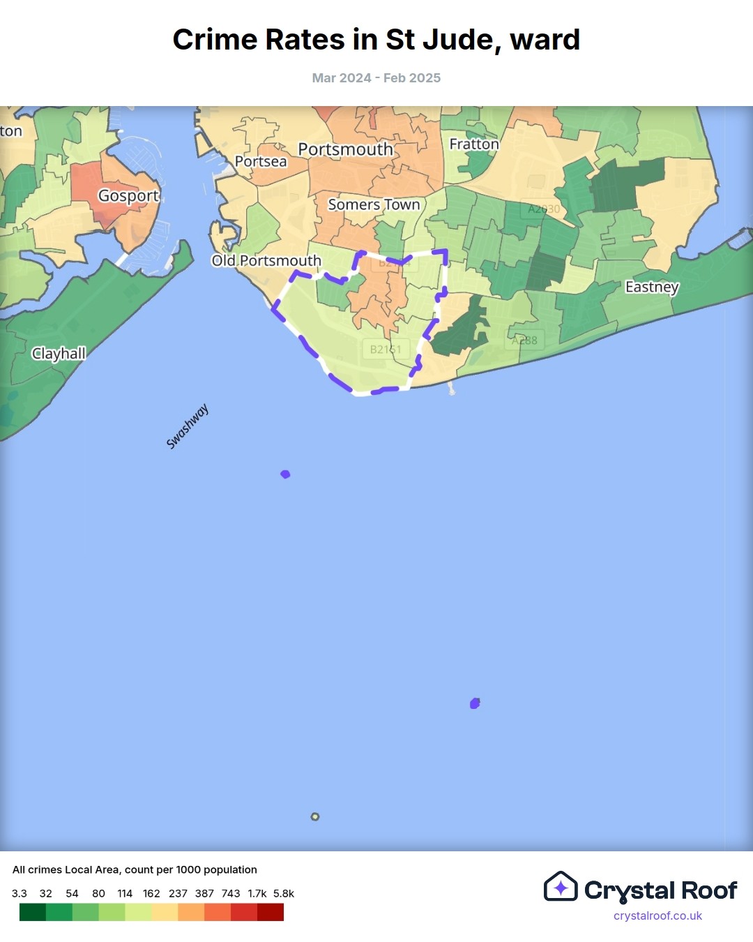 St Jude (ward) is located within Portsmouth (borough). Annual total crime rate in Portsmouth (borough) is 129 crimes per thousand resident population, which can be rated as 6 out of 10 or medium crime level compared to other local authority districts in England and Wales.
