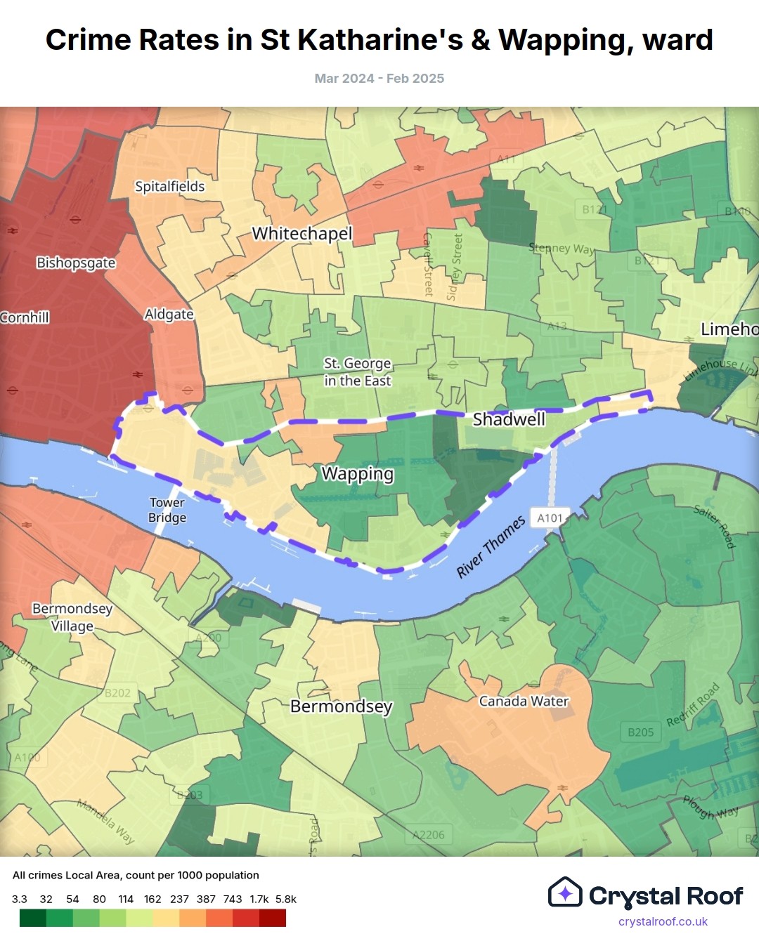 St Katharine's & Wapping, (ward) includes areas with the following crime ratings (see map):