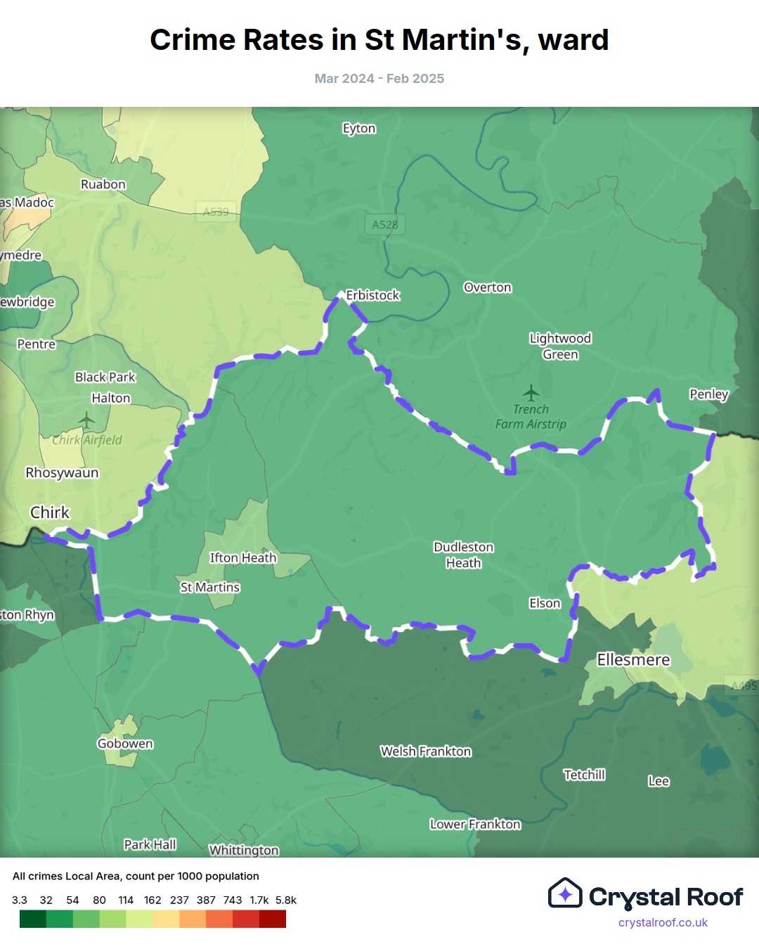 St Martin's (ward) is located within Shropshire (borough). Annual total crime rate in Shropshire (borough) is 62.3 crimes per thousand resident population, which can be rated as 2 out of 10 or low crime level compared to other local authority districts in England and Wales.
