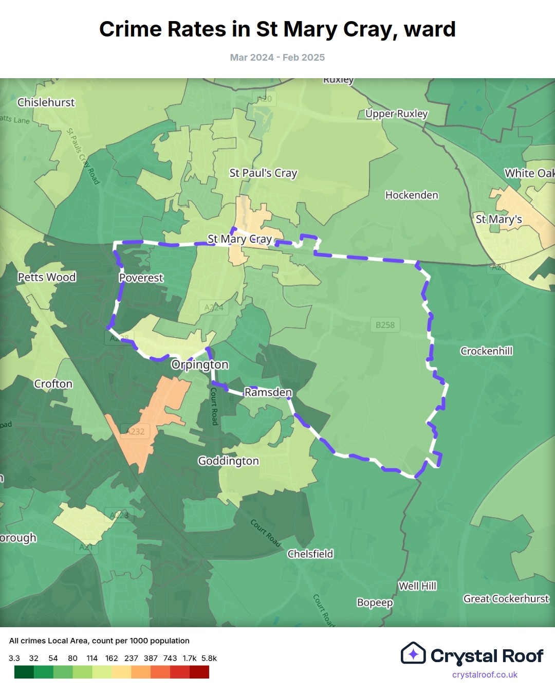 St Mary Cray, (ward) includes areas with the following crime ratings (see map):