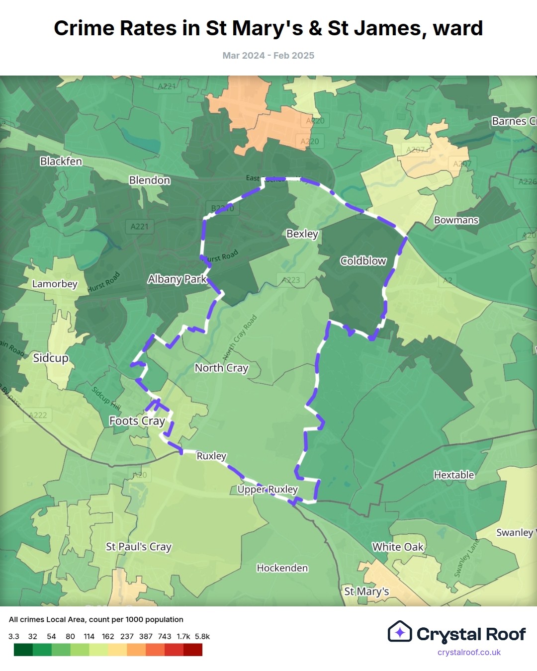 St Mary's & St James (ward) is located within Bexley (borough). Annual total crime rate in Bexley (borough) is 80.4 crimes per thousand resident population, which can be rated as 3 out of 10 or low crime level compared to other local authority districts in England and Wales.