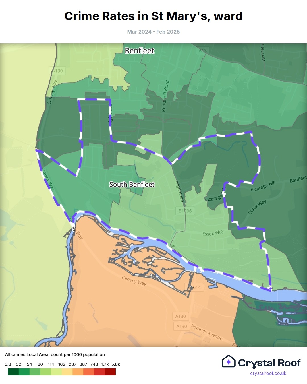 St Mary's (ward) is located within Castle Point (borough). Annual total crime rate in Castle Point (borough) is 61.2 crimes per thousand resident population, which can be rated as 2 out of 10 or low crime level compared to other local authority districts in England and Wales.