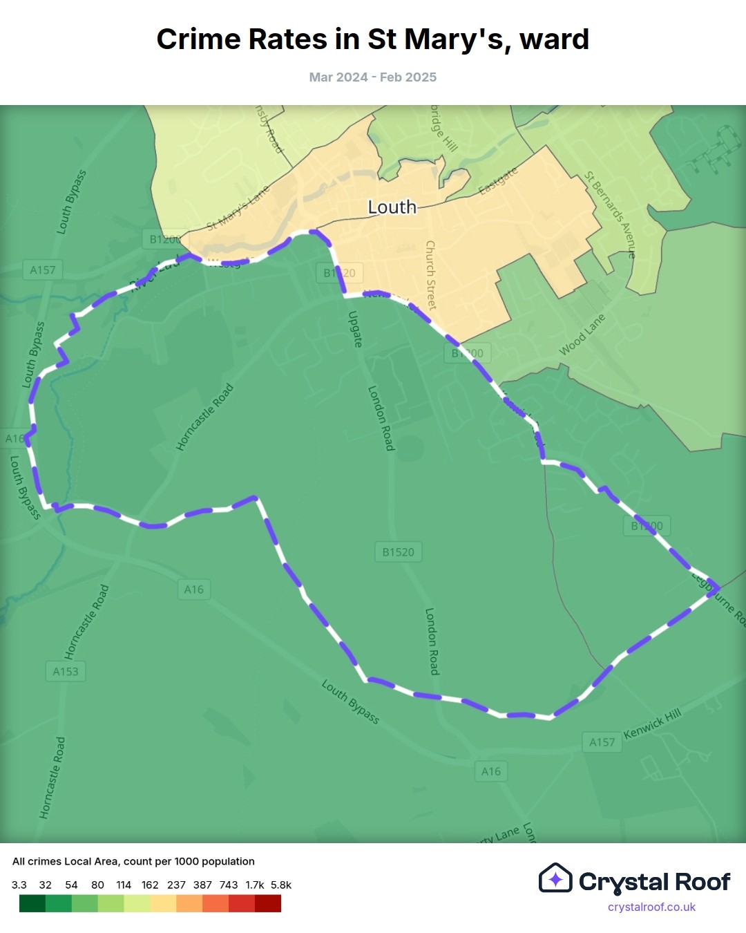 St Mary's (ward) is located within East Lindsey (borough). Annual total crime rate in East Lindsey (borough) is 93 crimes per thousand resident population, which can be rated as 4 out of 10 or low crime level compared to other local authority districts in England and Wales.