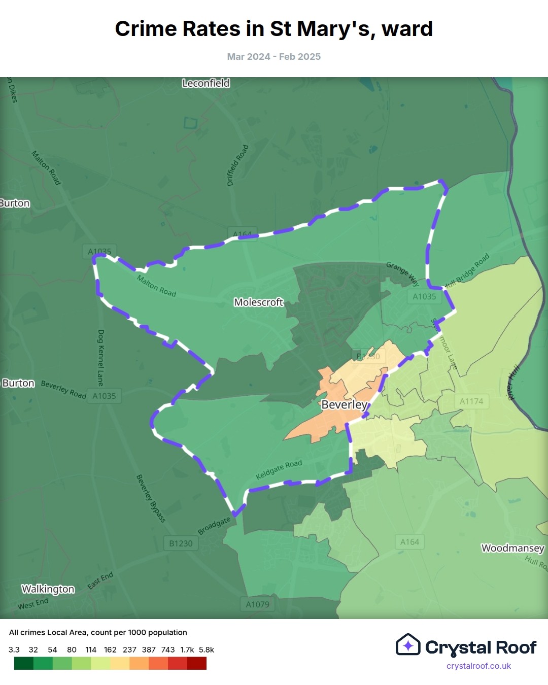 St Mary's (ward) is located within East Riding of Yorkshire (borough). Annual total crime rate in East Riding of Yorkshire (borough) is 56.8 crimes per thousand resident population, which can be rated as 1 out of 10 or low crime level compared to other local authority districts in England and Wales.