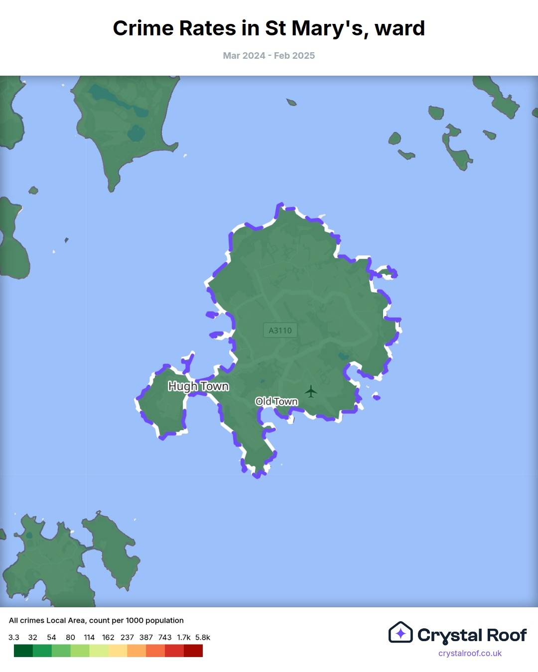 St Mary's (ward) is located within Isles of Scilly (borough). Annual total crime rate in Isles of Scilly (borough) is 36.5 crimes per thousand resident population, which can be rated as 1 out of 10 or low crime level compared to other local authority districts in England and Wales.