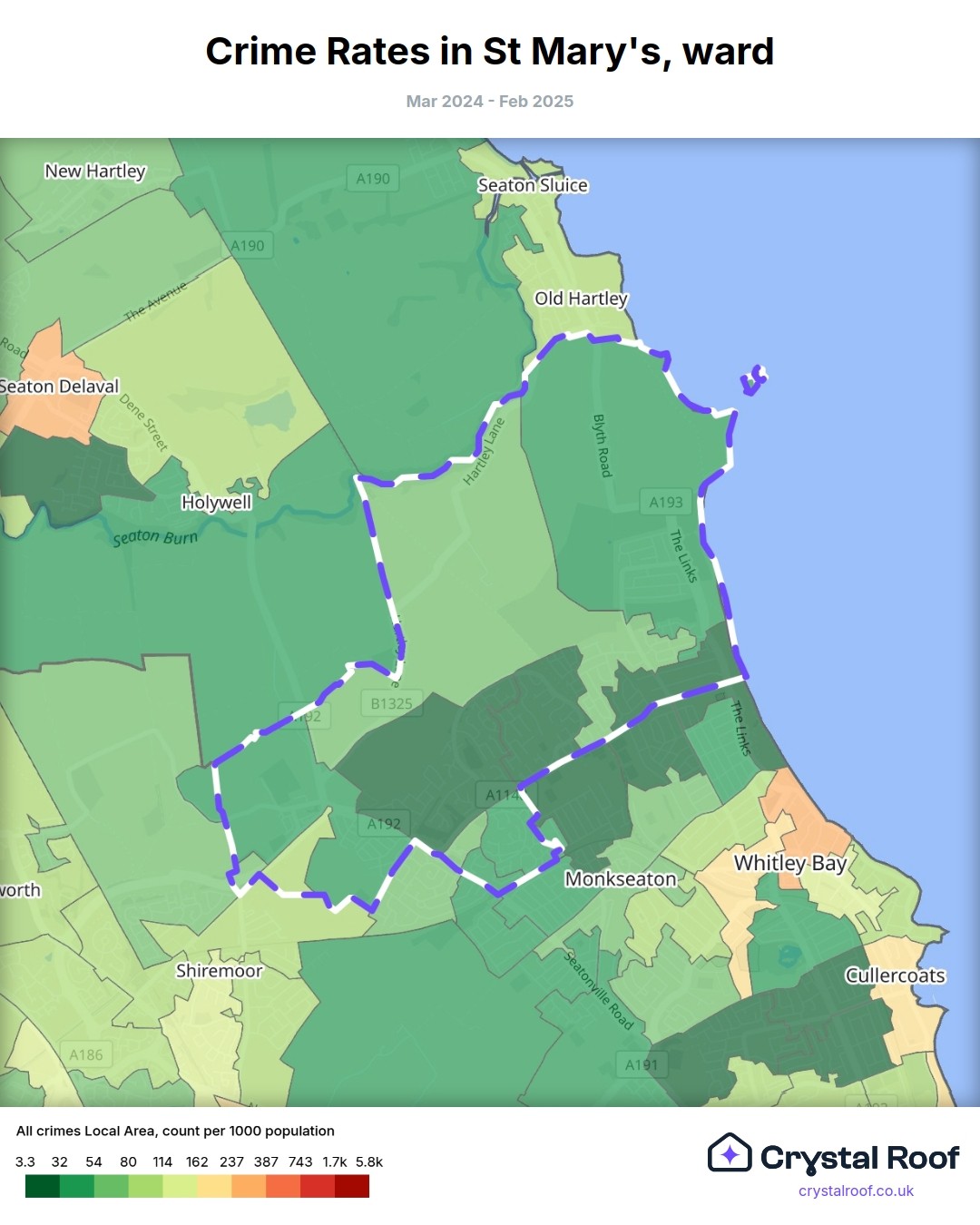 St Mary's (ward) is located within North Tyneside (borough). Annual total crime rate in North Tyneside (borough) is 105 crimes per thousand resident population, which can be rated as 5 out of 10 or medium crime level compared to other local authority districts in England and Wales.