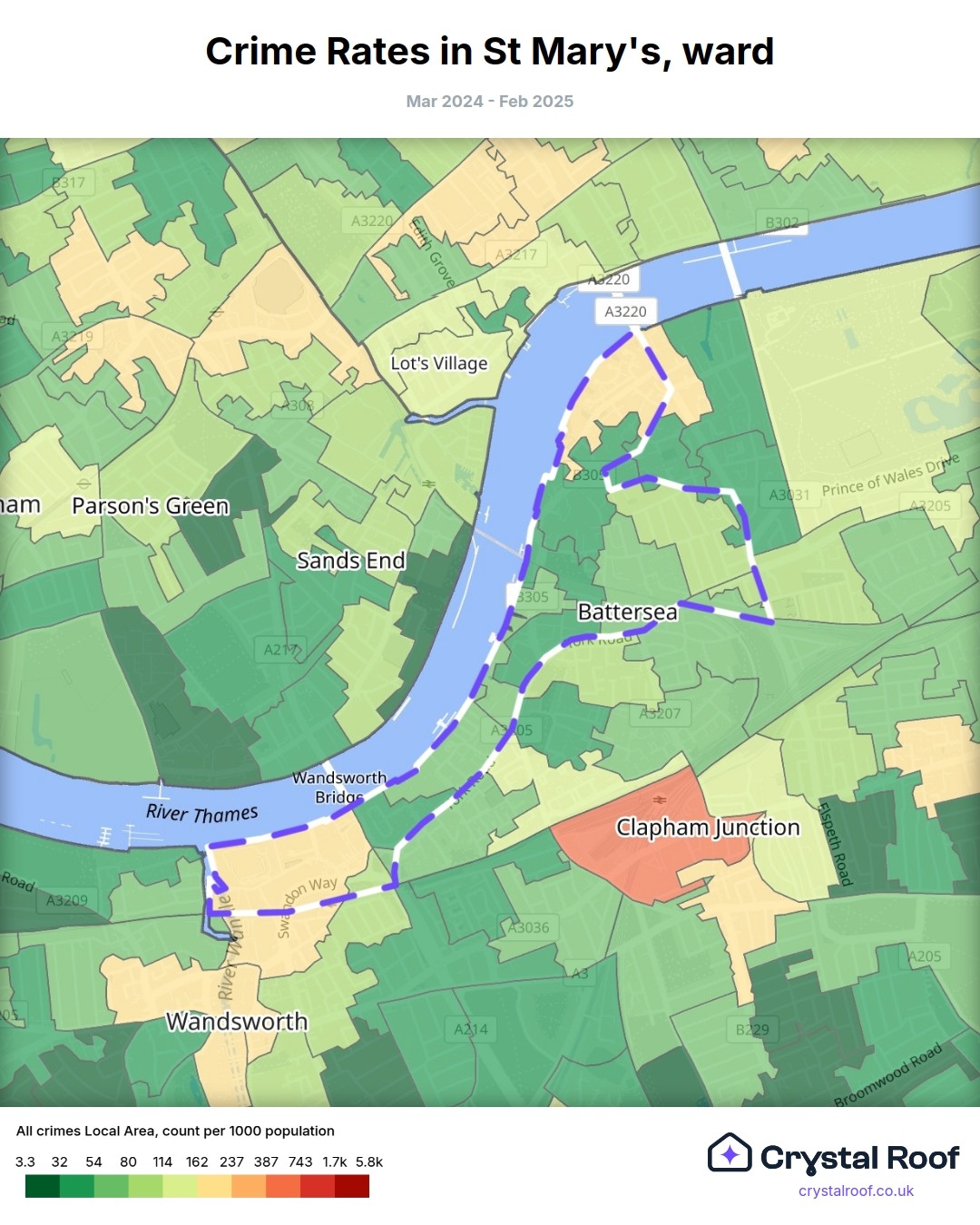St Mary's (ward) is located within Wandsworth (borough). Annual total crime rate in Wandsworth (borough) is 103 crimes per thousand resident population, which can be rated as 5 out of 10 or medium crime level compared to other local authority districts in England and Wales.