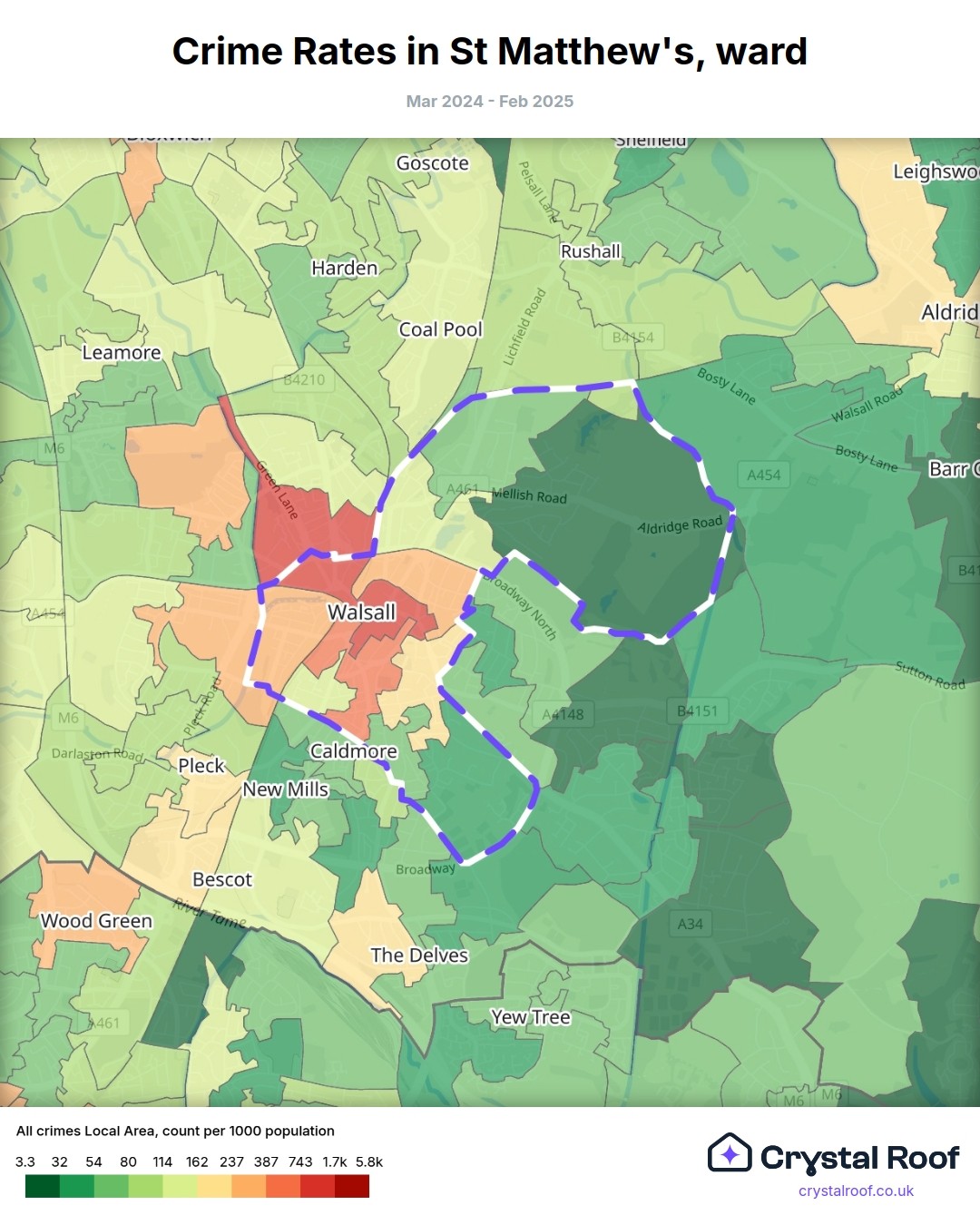 St Matthew's (ward) is located within Walsall (borough). Annual total crime rate in Walsall (borough) is 104 crimes per thousand resident population, which can be rated as 5 out of 10 or medium crime level compared to other local authority districts in England and Wales.