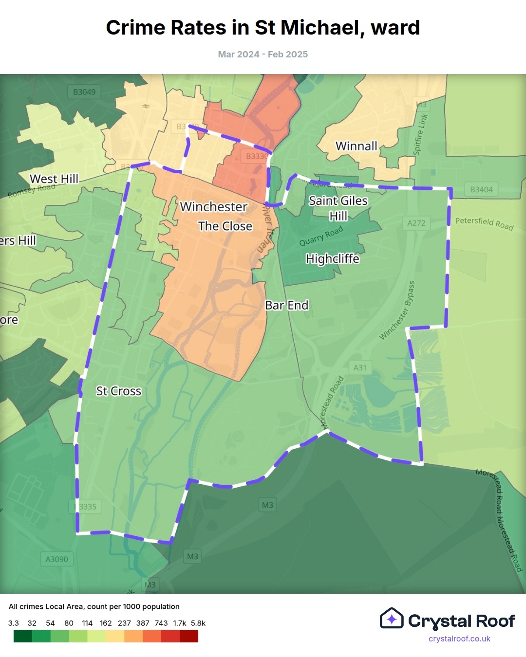 St Michael (ward) is located within Winchester (borough). Annual total crime rate in Winchester (borough) is 64.9 crimes per thousand resident population, which can be rated as 2 out of 10 or low crime level compared to other local authority districts in England and Wales.