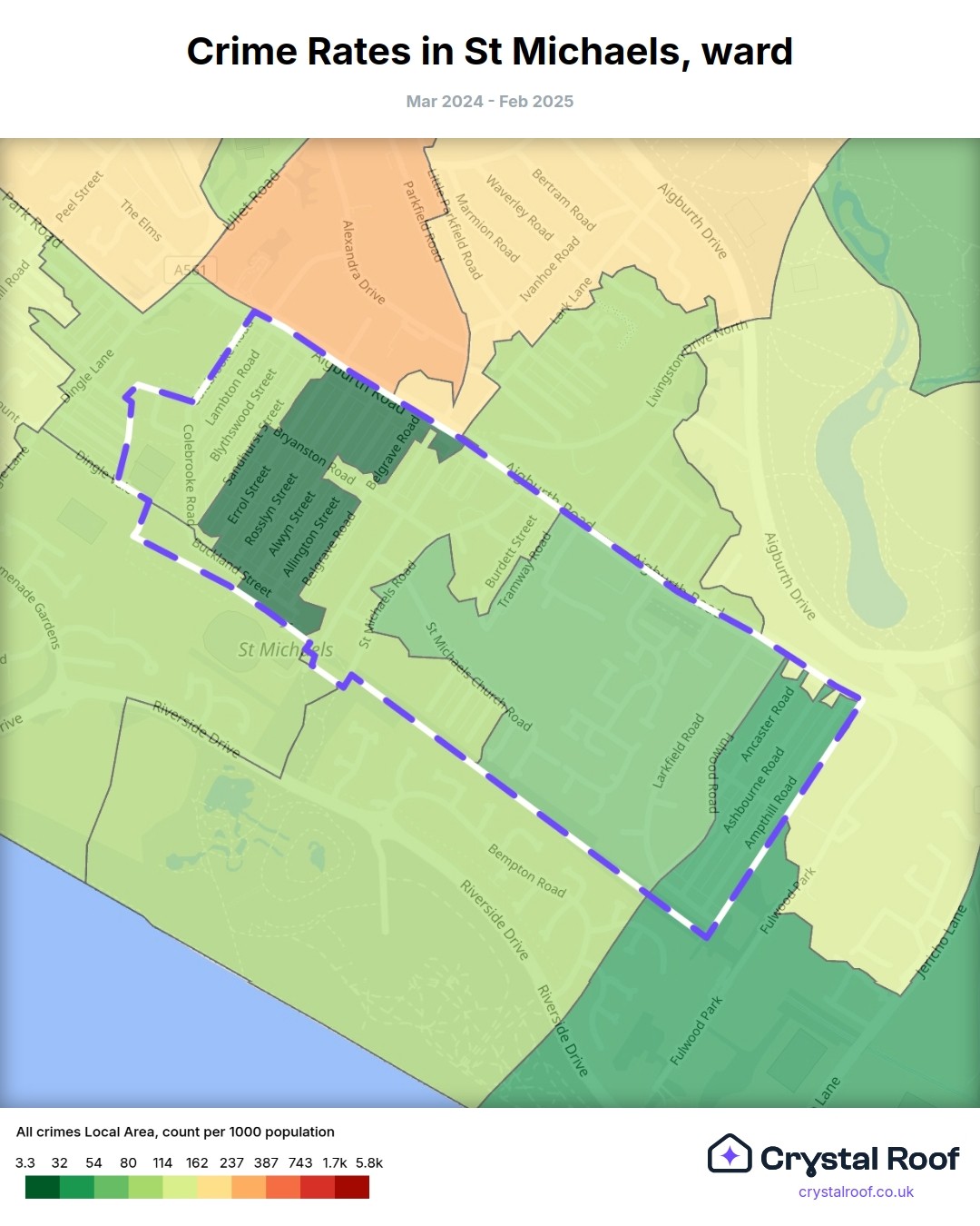 St Michaels, (ward) includes areas with the following crime ratings (see map):
