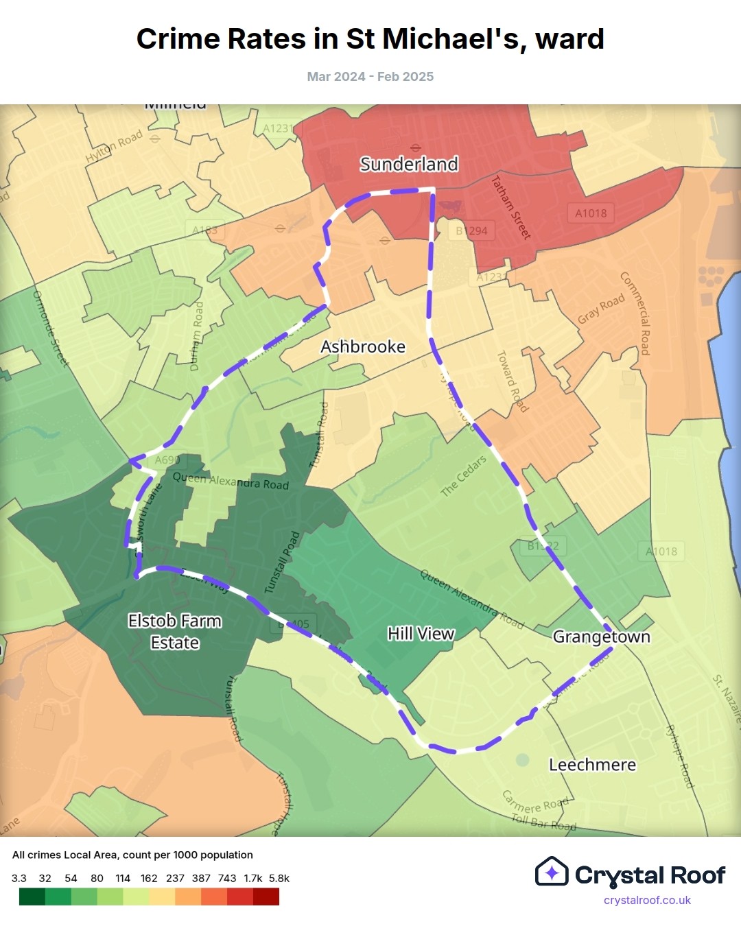 St Michael's (ward) is located within Sunderland (borough). Annual total crime rate in Sunderland (borough) is 122 crimes per thousand resident population, which can be rated as 6 out of 10 or medium crime level compared to other local authority districts in England and Wales.