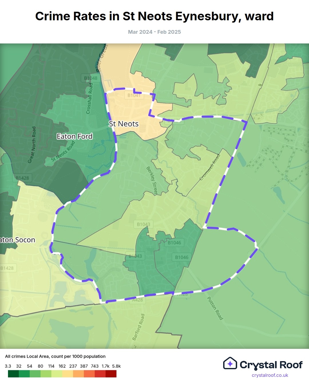 The figures in grey indicate the relative ratings of St Neots Eynesbury (ward) for a specific crime type compared to other wards in England and Wales.