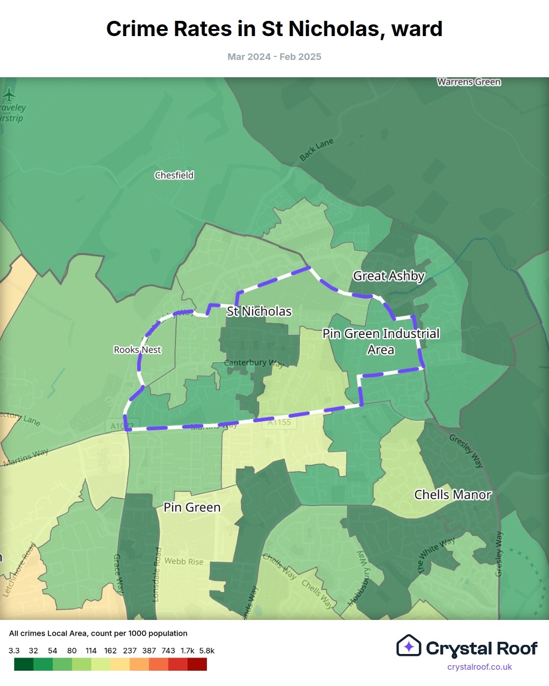 St Nicholas (ward) is located within Stevenage (borough). Annual total crime rate in Stevenage (borough) is 111 crimes per thousand resident population, which can be rated as 5 out of 10 or medium crime level compared to other local authority districts in England and Wales.