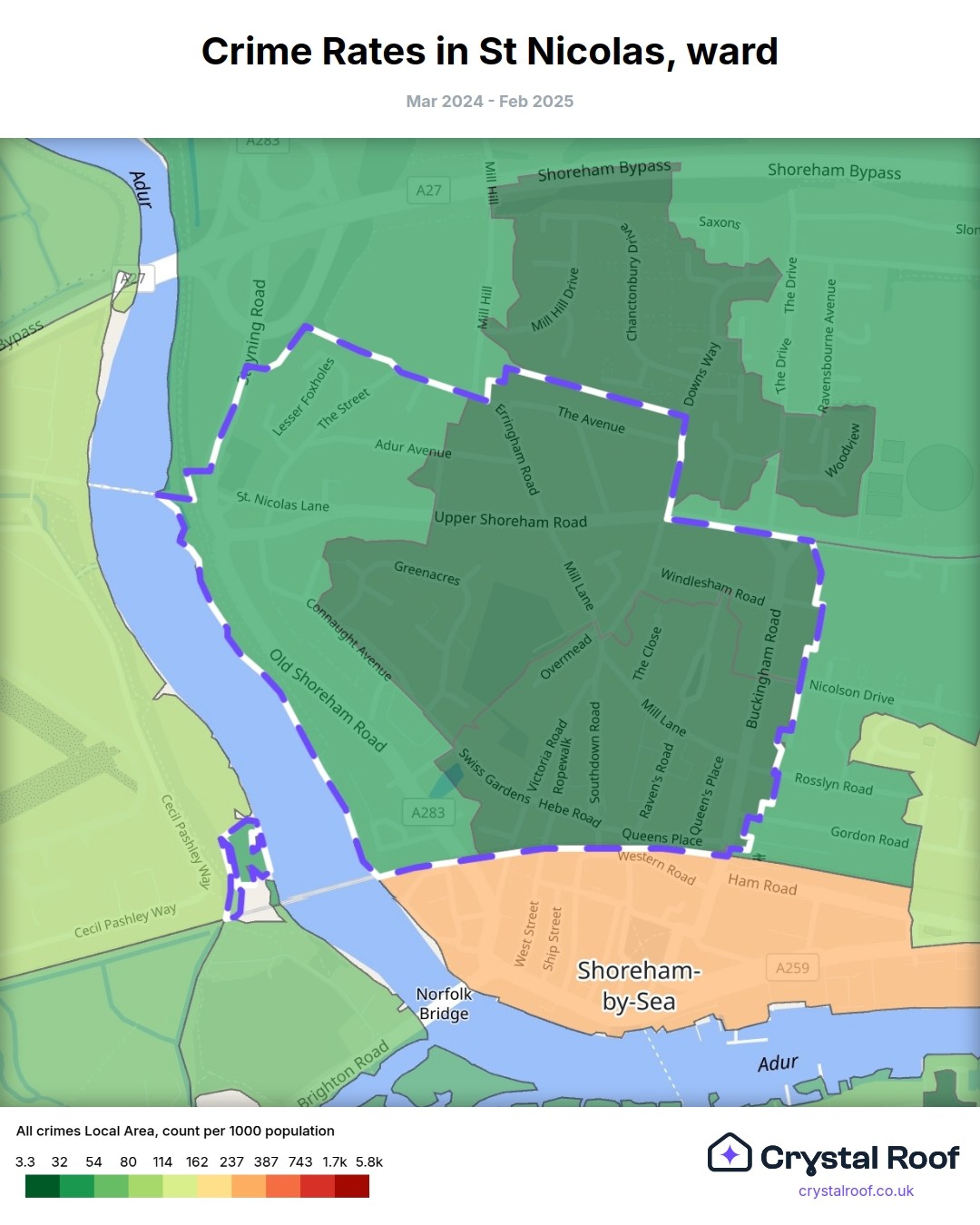 St Nicolas (ward) is located within Adur (borough). Annual total crime rate in Adur (borough) is 69.8 crimes per thousand resident population, which can be rated as 2 out of 10 or low crime level compared to other local authority districts in England and Wales.