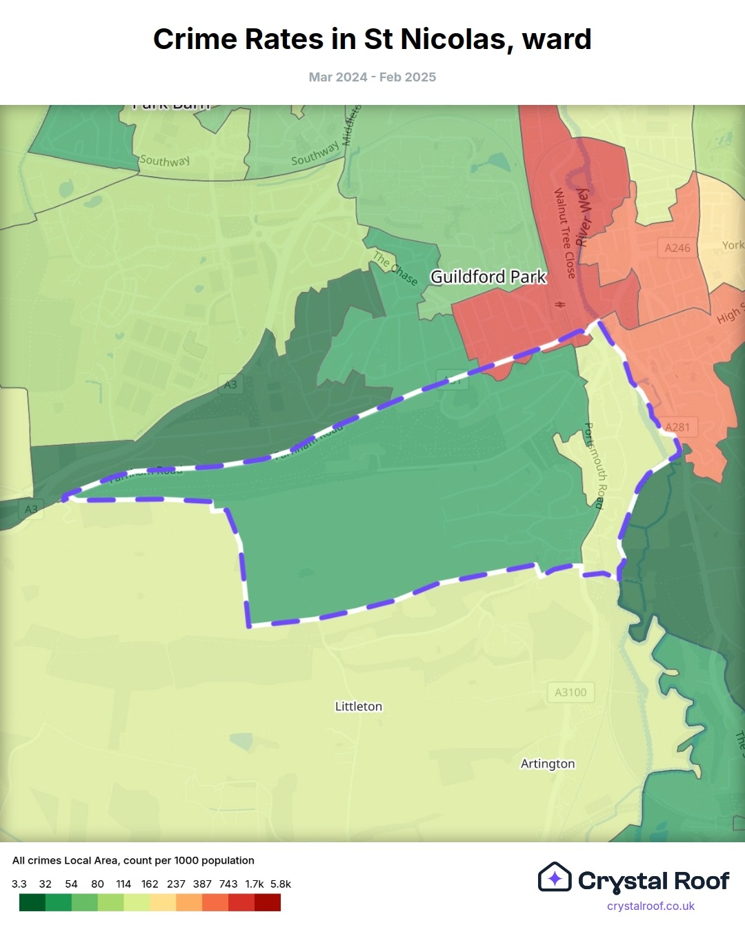 St Nicolas (ward) is located within Guildford (borough). Annual total crime rate in Guildford (borough) is 89.5 crimes per thousand resident population, which can be rated as 4 out of 10 or low crime level compared to other local authority districts in England and Wales.