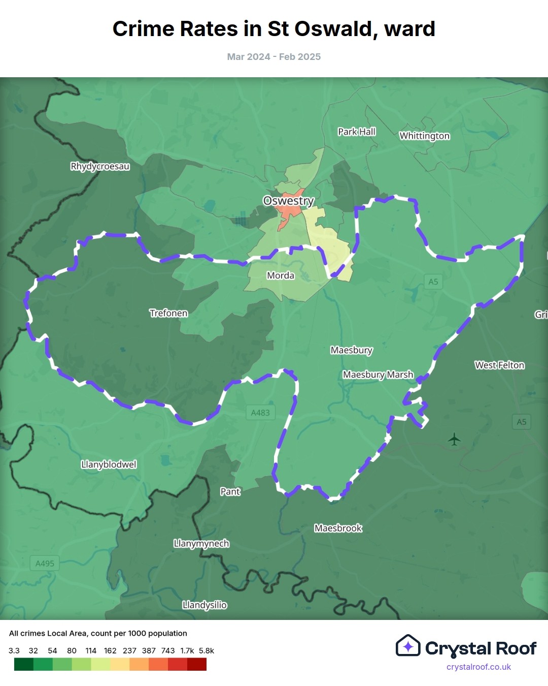 Historical crime rates in St Oswald (ward), Shropshire (local authority district) and West Midlands (region)