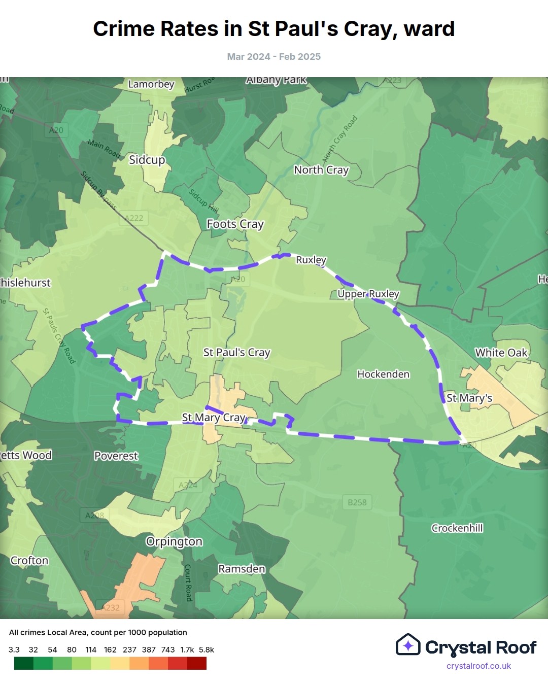 St Paul's Cray, (ward) includes areas with the following crime ratings (see map):