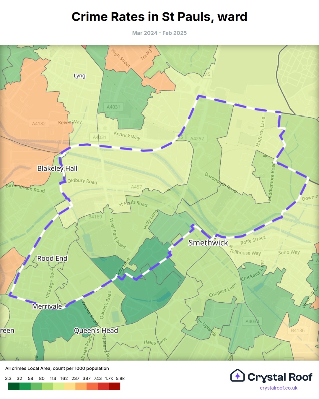 The figures in grey indicate the relative ratings of St Pauls (ward) for a specific crime type compared to other wards in England and Wales.