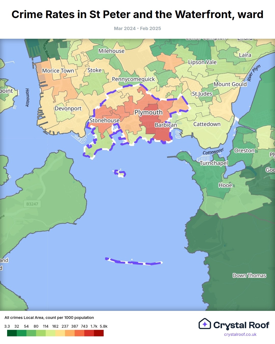 St Peter and the Waterfront (ward) is located within Plymouth (borough). Annual total crime rate in Plymouth (borough) is 114 crimes per thousand resident population, which can be rated as 5 out of 10 or medium crime level compared to other local authority districts in England and Wales.
