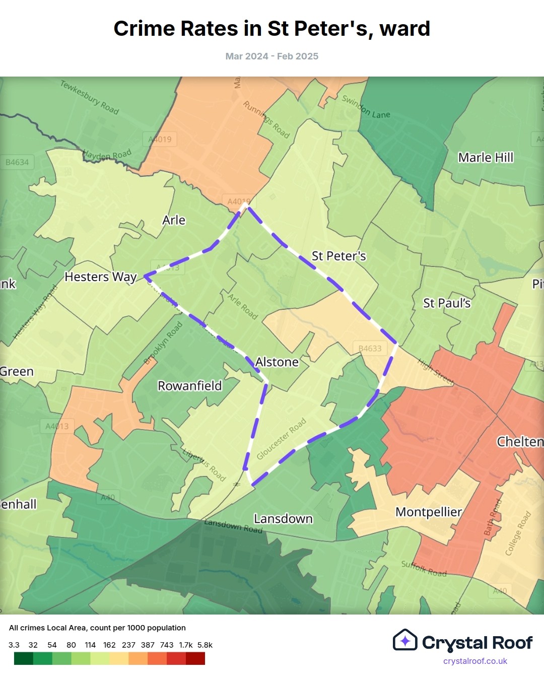 St Peter's (ward) is located within Cheltenham (borough). Annual total crime rate in Cheltenham (borough) is 107 crimes per thousand resident population, which can be rated as 5 out of 10 or medium crime level compared to other local authority districts in England and Wales.