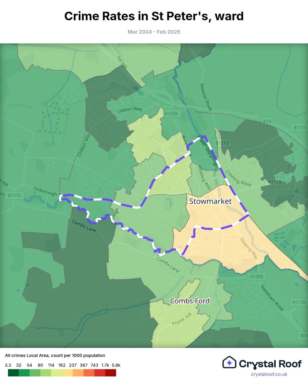 St Peter's (ward) is located within Mid Suffolk (borough). Annual total crime rate in Mid Suffolk (borough) is 42.4 crimes per thousand resident population, which can be rated as 1 out of 10 or low crime level compared to other local authority districts in England and Wales.