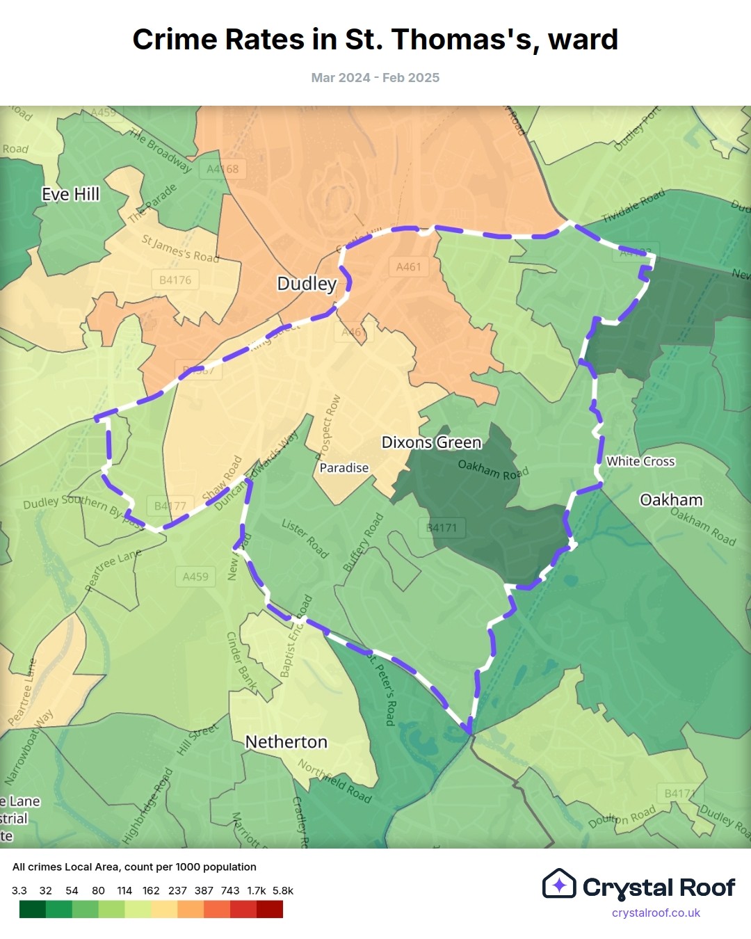 St. Thomas's (ward) is located within Dudley (borough). Annual total crime rate in Dudley (borough) is 84.9 crimes per thousand resident population, which can be rated as 3 out of 10 or low crime level compared to other local authority districts in England and Wales.