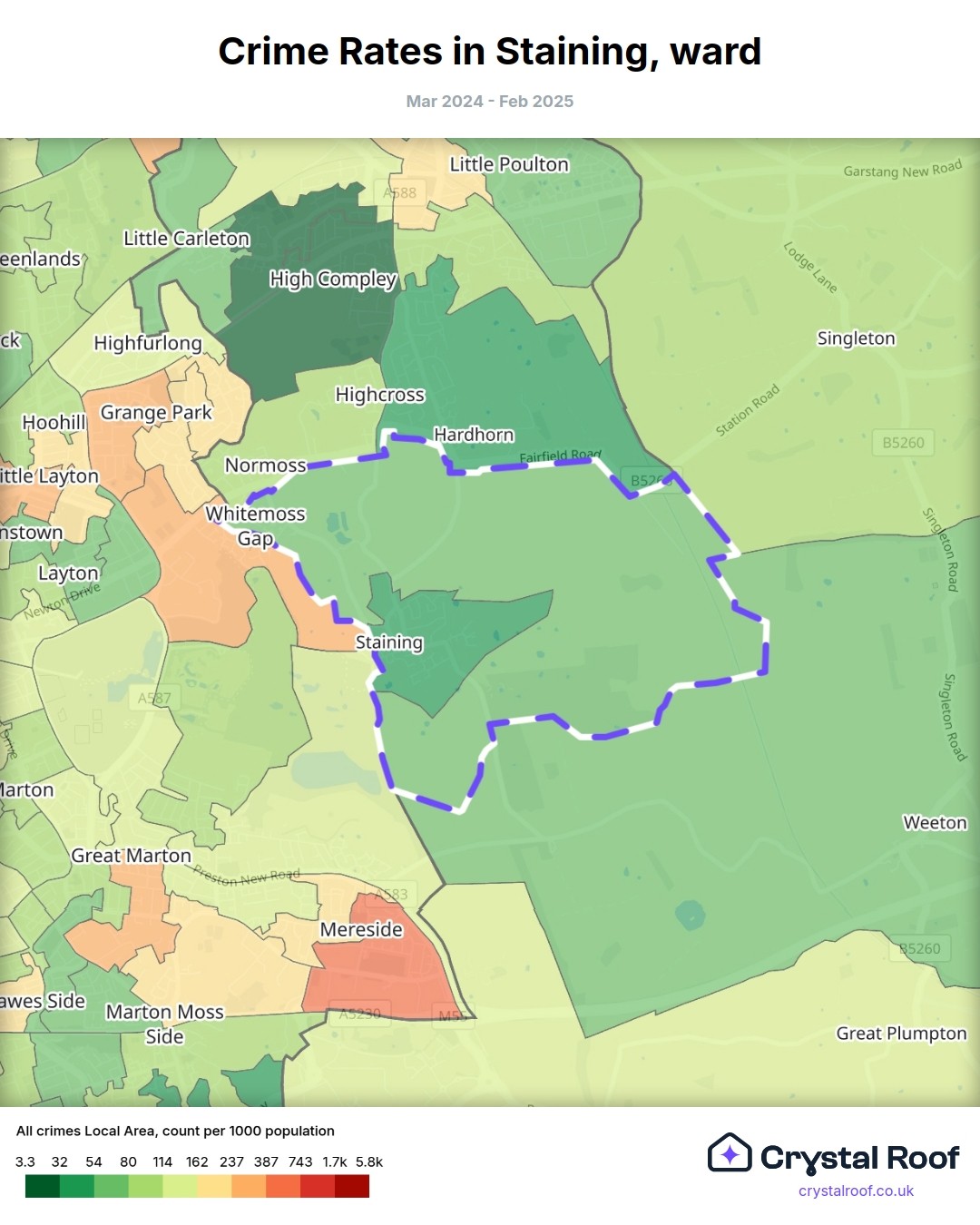 Staining, (ward) includes areas with the following crime ratings (see map):