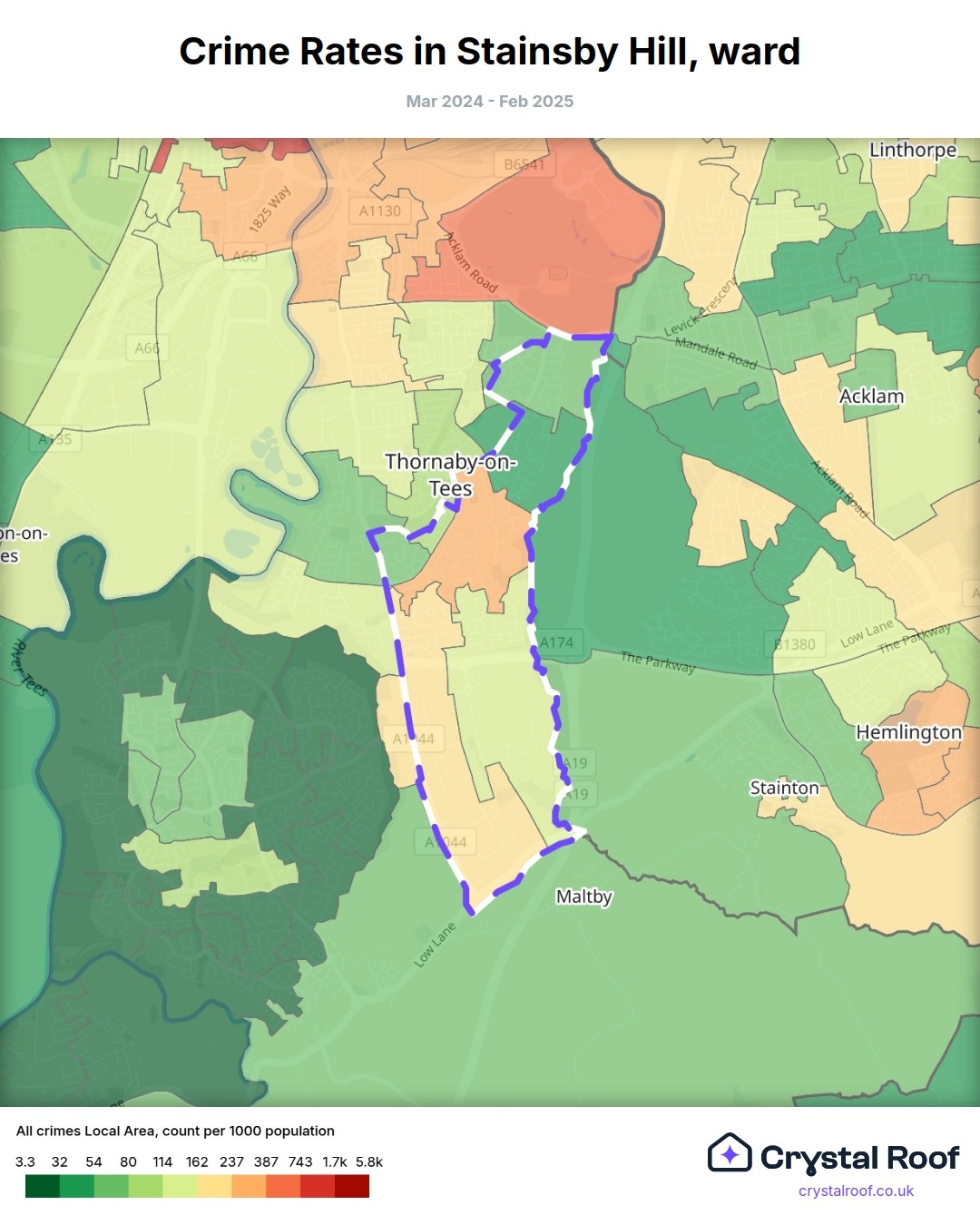 Stainsby Hill (ward) is located within Stockton-on-Tees (borough). Annual total crime rate in Stockton-on-Tees (borough) is 129 crimes per thousand resident population, which can be rated as 6 out of 10 or medium crime level compared to other local authority districts in England and Wales.