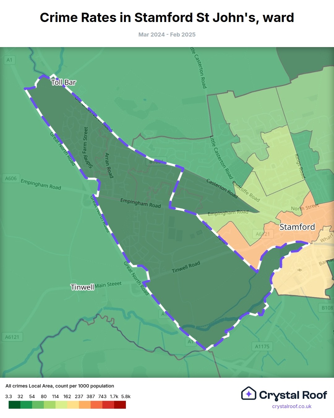 Stamford St John's, (ward) includes areas with the following crime ratings (see map):