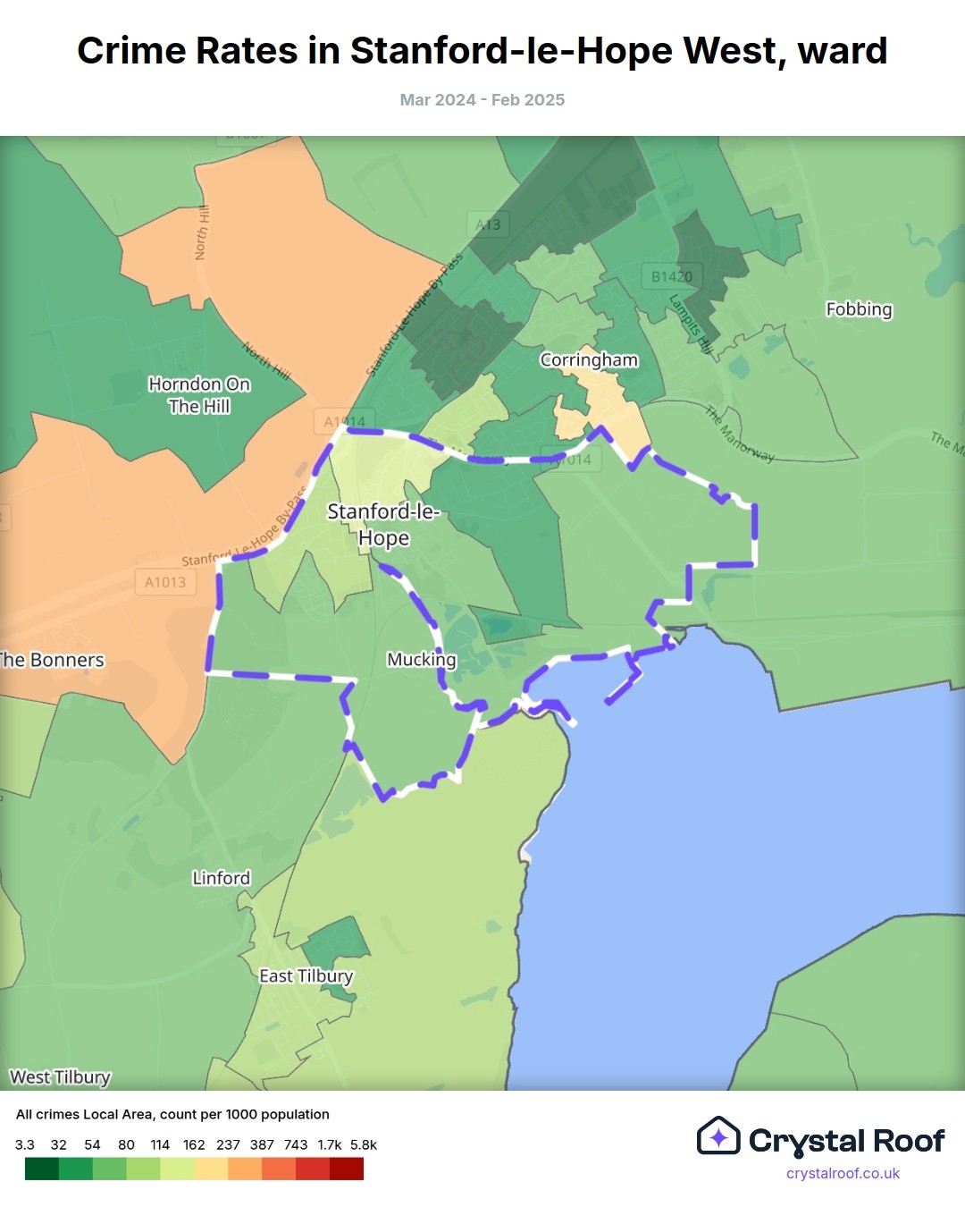 Stanford-le-Hope West, (ward) includes areas with the following crime ratings (see map):