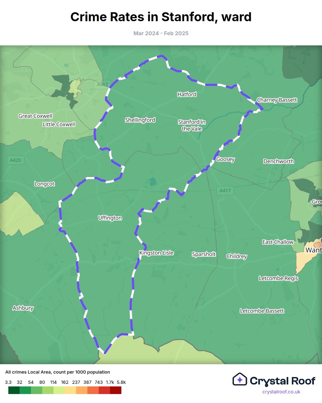 Stanford (ward) is located within Vale of White Horse (borough). Annual total crime rate in Vale of White Horse (borough) is 58.9 crimes per thousand resident population, which can be rated as 2 out of 10 or low crime level compared to other local authority districts in England and Wales.